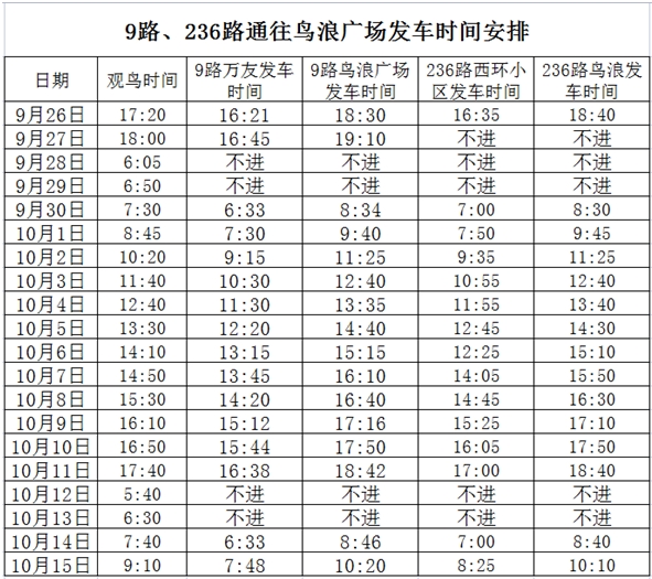 為方便市民“國慶”“中秋”節(jié)日期間觀賞自然景觀時順暢出行,營口交運集團適時調整部分公交線路班次。從9月26日起—10月15日,公交9路、236路分時段區(qū)間延伸至大遼河口鳥浪廣場運營。